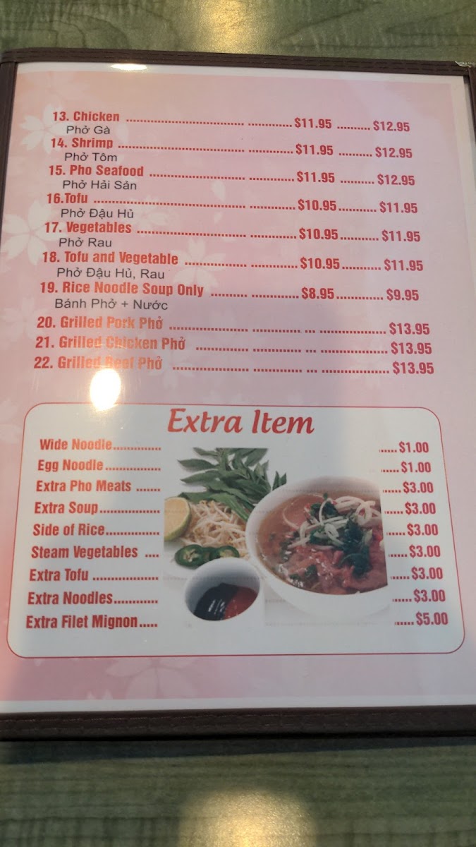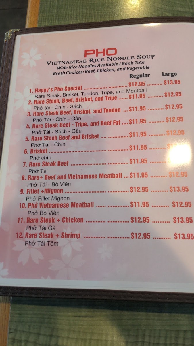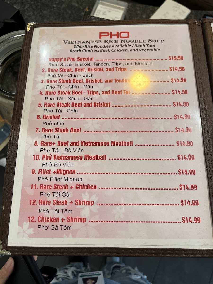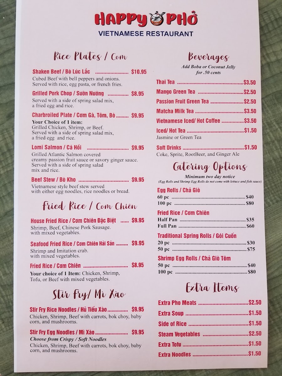 From a reviewer’s perspective, the menu at Happy Pho offers a well-rounded selection of Vietnamese comfort food and popular Asian dishes, making it easy for diners to find something satisfying at a reasonable price. The appetizers like Shrimp Spring Rolls, Traditional Spring Rolls / Gỏi Cuốn, Vietnamese Wings / Cánh Gà Chiên Nước Mắm, and Tofu Spring Rolls / Gỏi Cuốn Chay are great starters, while heartier options such as Beef Stew / Bò Kho, Shaken Beef / Bò Lúc Lắc, Grilled Pork Chop / Sườn Nướng, and Crispy Rice Combination Pot provide filling meal choices. The menu also includes flavorful stir-fry dishes like Shrimp Pad Thai, Chicken Pad Thai, and Filet Mignon Chow Mein, along with rice favorites such as Seafood Fried Rice / Cơm Chiên Hải Sản and House Fried Rice / Cơm Chiên Đặc Biệt. For noodle lovers, the pho selection-featuring Grilled Pork Pho, Vietnamese Meatball Pho, Rare Steak Beef Pho, Seafood Pho, and Tofu Pho-is a highlight, complemented by vermicelli dishes like the Combination Bowl and Vermicelli Bowl. To complete the meal, beverages such as Thai Tea, Vietnamese Ice Coffee, Mango Smoothie, and Avocado Smoothie offer refreshing options. Overall, the menu provides a diverse mix of classic Vietnamese dishes and familiar favorites, making it a solid choice for both first-time visitors and regulars looking for comforting, flavorful meals.